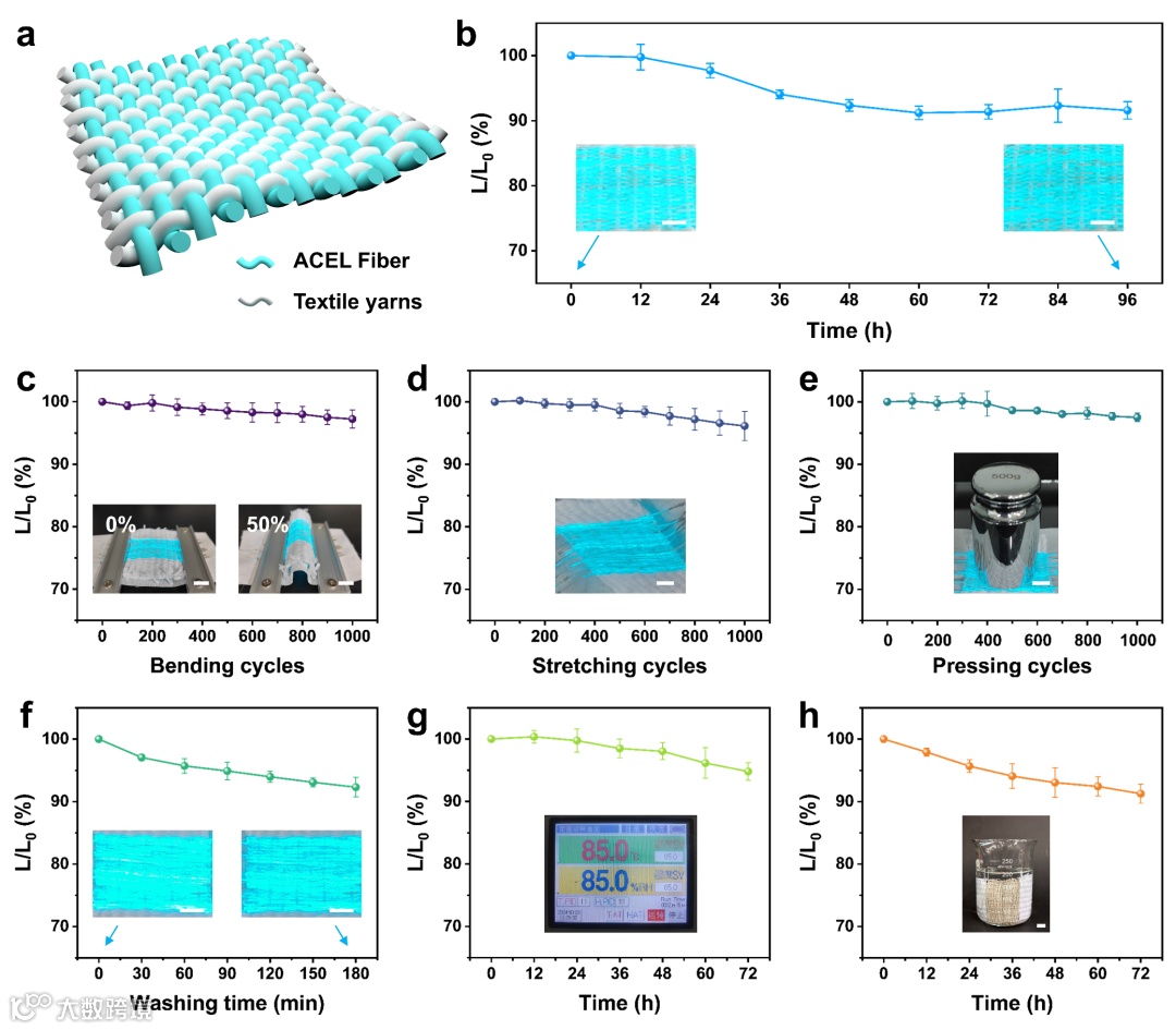 Fig. 4 Performance and durability of ACEL fabrics. (Scale bar, 1 cm. Data presented as mean ± SD, N=3) a Schematic illustration of the plain weave structure of ACEL fabrics. b Durability test results, inset: photographs of ACEL fabric before and after 96 hours of continuous electroluminescence operation. c Bending test, inset: photographs of ACEL fabrics at bending ratios of 0 and 50 %. d Tensile test results, inset: photograph of ACEL fabric under tensile deformation. e Compression test, inset: photograph showing ACEL fabric compressed by a 500 g weight. f Washing test, inset: photograph of ACEL fabric before and after washing for 180 minutes. g Double 85 wet-hot test, inset: interface displaying the parameter settings of the constant temperature and humidity chamber. h Sweat resistance test, inset: photograph of ACEL fabric immersed in synthetic sweat.