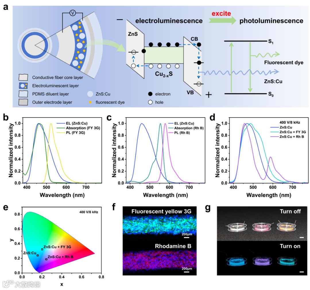 Fig. 2 Color-conditioning properties of ACEL fibers. a Schematic representation of the structure and color-conditioning mechanism of multicolor ACEL fibers. b Absorption and photoluminescence (PL) spectra of the FY 3G dye. c Absorption and PL spectra of Rh B dye. d Comparison of electroluminescence (EL) spectra of ACEL fibers with and without the color conversion layer. e CIE coordinates of ACEL fibers with and without the color conversion layer. f Fluorescence microscopy images of ACEL fibers integrated with FY 3G and Rh B color conversion layers. g Visual representation of ACEL fibers exhibiting different colors. Scale bar, 1 cm.