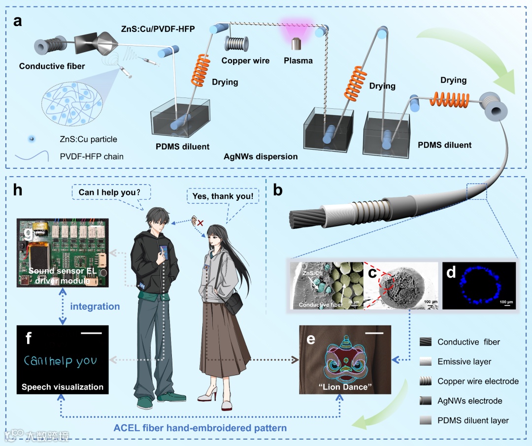 Fig. 1 Design, fabrication, and integration of ACEL fiber-based sound-sensing visual display system. a Schematic diagram of the ACEL fiber preparation process, with an inset showing the luminescent spinning solution composition. b Structural representation of the core-multi-shell ACEL fiber, illustrating its functional layers. c Scanning electron microscopy (SEM) image of the ACEL fiber cross-section, showing the distinct layer structure. d Fluorescence microscopy image of the ACEL fiber cross-section, highlighting the uniform distribution of fluorescent dyes within the color conversion layer. e Example of ACEL fiber integrated into a hand-embroidered “Lion Dance” light-emitting textile pattern. Scale bar, 5 cm. f Luminescent hand-embroidered sentence/word pattern of ACEL fiber used for sound-sensing applications. Scale bar, 5 cm. g A physical image of the sound-sensing EL driver module, designed for speech recognition and volume detection. Scale bar, 1 cm. h Diagram of application scenarios, where the sound sensor captures sound signals to control the light-emitting display of ACEL fibers, facilitating visual barrier-free communication for hearing-impaired individuals.