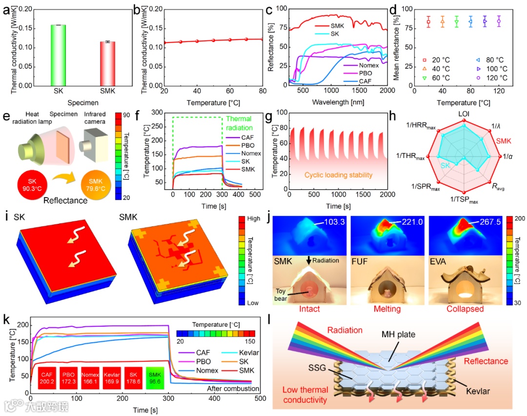 在热防护方面,整齐排列且具有高反射性的六方氢氧化镁能够反射大量的辐射热,减少传导到人体的热量。同时,各向异性的分层结构使热量横向扩散,大幅度增加了散热面积,减少了纵向的热量传导。因此,智能材料的结构能够显著减轻热辐射对人体的伤害。