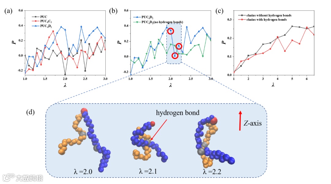 图2b显示,PUC4D1体系中选定链段的取向度在拉伸比λ=2.0时较高,但在λ=2.1时突然下降,并于λ=2.2时再次升高。图2d展示了PUC4D1体系选定链段在不同应变下的构象快照:在λ=2.0时,选定链段(蓝色珠子)沿拉伸方向呈现较高取向度,其与邻近链段(黄色珠子)间仅存在配位键(红色珠子),未形成氢键;在λ=2.1时,链段取向度降低,此时除配位键外,两链段间形成了氢键。这表明新氢键的形成会导致局部链段取向度下降,因为氢键相互作用方向与拉伸方向不一致;在λ=2.2时,氢键断裂,配位键仍存在,局部链段取向度得以恢复。值得注意的是,在消除氢键相互作用的PUC4D1模拟体系中(图2b),链段取向度的波动显著弱于含氢键的体系,证实氢键的存在确实促进了局部链段的波动。图2c进一步对比了PUC4D1体系中参与氢键形成的链段与未参与氢键形成的链段,前者取向度更低,确证了氢键形成会降低局部链段取向度。
