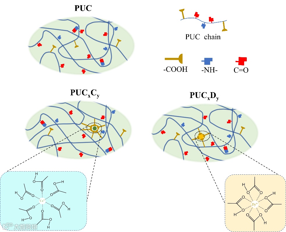 图1 基于氢键网络和配位键网络的双网络PU弹性体的结构示意图。
