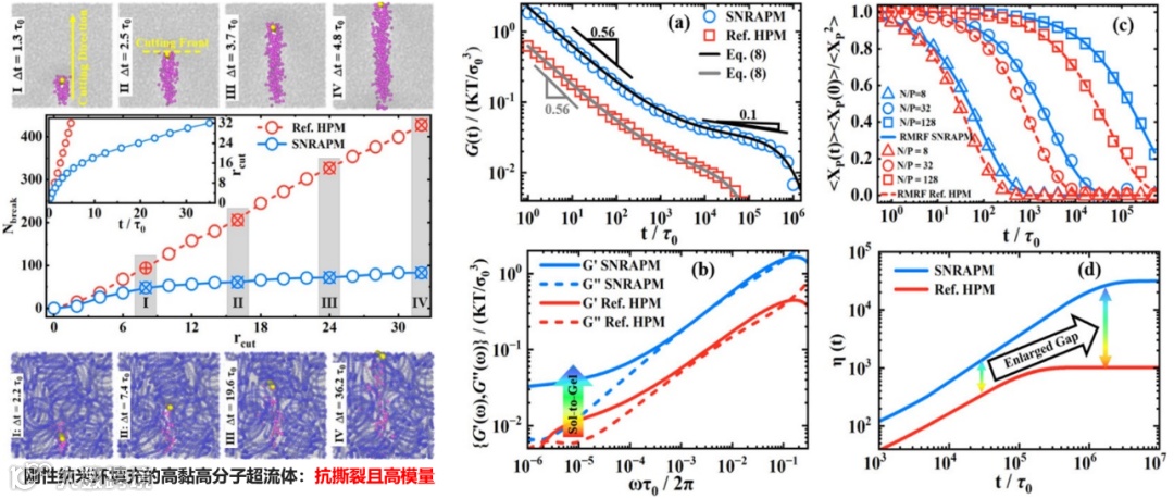 近几年,曹学正教授课题组发展了关于软物质与生物体系大分子平衡与非平衡弛豫的跨尺度标度理论,实现了对该类体系黏弹特征的动态力学理论表征【Phys. Rev. E (Letter) 2022 & Phys. Rev. E 2021】,并在该标度理论基础上开发了高效精准跨尺度流变统计算法软件,覆盖跨108剪切频域宽度的复杂流变场景【具有完全自主知识版权流变软件2024&2025】。基于课题组所发展的流变理论方法与模拟计算软件,本论文从流变学与软凝聚态物理角度揭示了SNRs作为动态应力耗散单元的微观动态力学机理。通过系统的流变统计模拟与物理分析,团队发现SNRs的贯穿拓扑约束,会显著缩短高分子链静态与动态缠结长度,对高分子链弛豫的抑制效果远超传统链间缠结,导致高分子熔体转变为类凝胶超粘流体。撕裂模拟与应力-应变关系证实,SNRs能通过链滑移耗散外作用能量,保护高分子网络结构免受破坏。定量的流变统计计算和物理分析揭示,高分子链贯穿SNRs的动态滑移机制能将外应力集中作用在纳米环上,从而显著减少高分子链断裂。这种“拓扑增强-动态耗散”双机制突破了传统交联网络的局限性,不仅克服了传统材料的黏弹性能瓶颈,还赋予独特的流体自修复特性,为理解复杂高分子体系的跨尺度流变行为提供了全新动态力学机理框架,将在航空防护层、高性能轮胎、防弹高分子薄层和高安全新能源聚电解质电池等领域展现出重要前沿应用潜力。