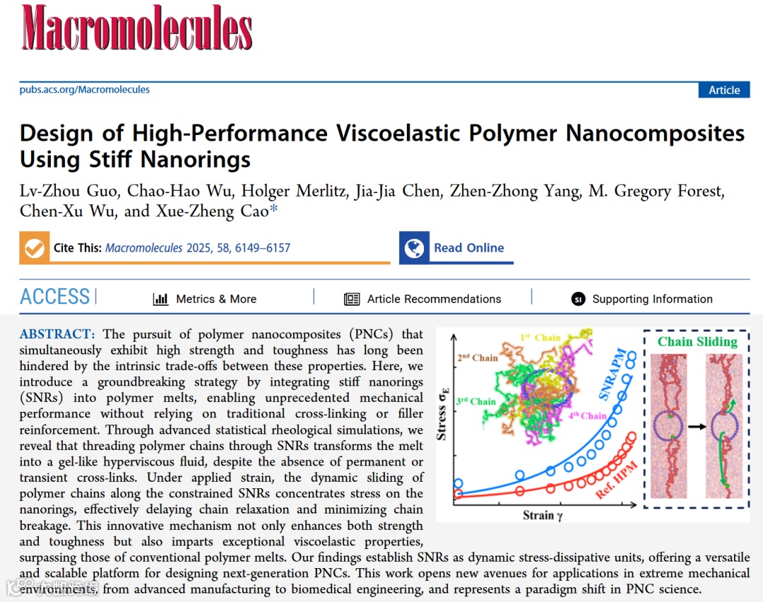 该研究工作以“Design of High-Performance Viscoelastic Polymer Nanocomposites Using Stiff Nanorings”为题发表在高分子TOP期刊《Macromolecules》上。文章第一作者为厦门大学物理系研究生郭绿洲,通讯作者为厦门大学物理系曹学正教授。合作作者包括厦门大学物理吴晨旭教授/化学系陈嘉嘉教授、德累斯顿莱布尼茨聚合物研究所Holger Merlitz教授、清华大学化工系杨振忠教授和北卡罗莱纳大学M. Gregory Forest教授等。