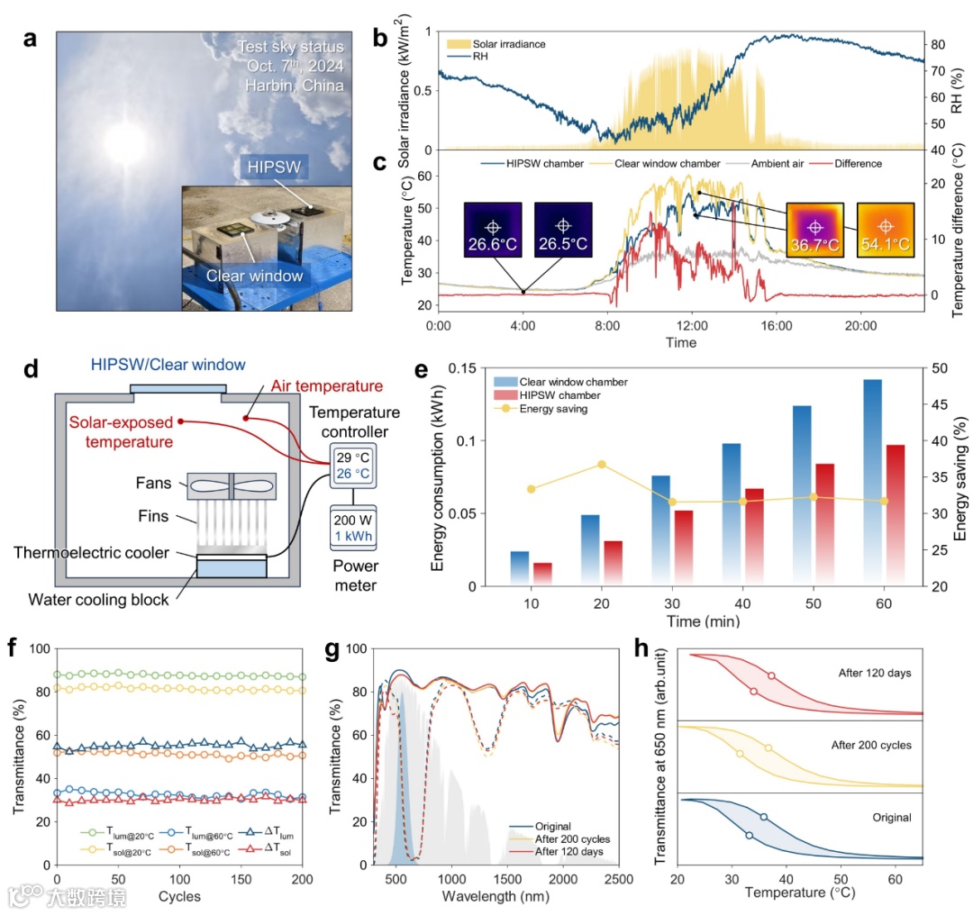 (3)测试评估:通过实地测试与建筑能耗模拟,验证了HIP智能窗(HIPSW)在自然环境下可实现自发激活,动态调控太阳热输入,展现出其在绿色建筑中的广泛应用前景。