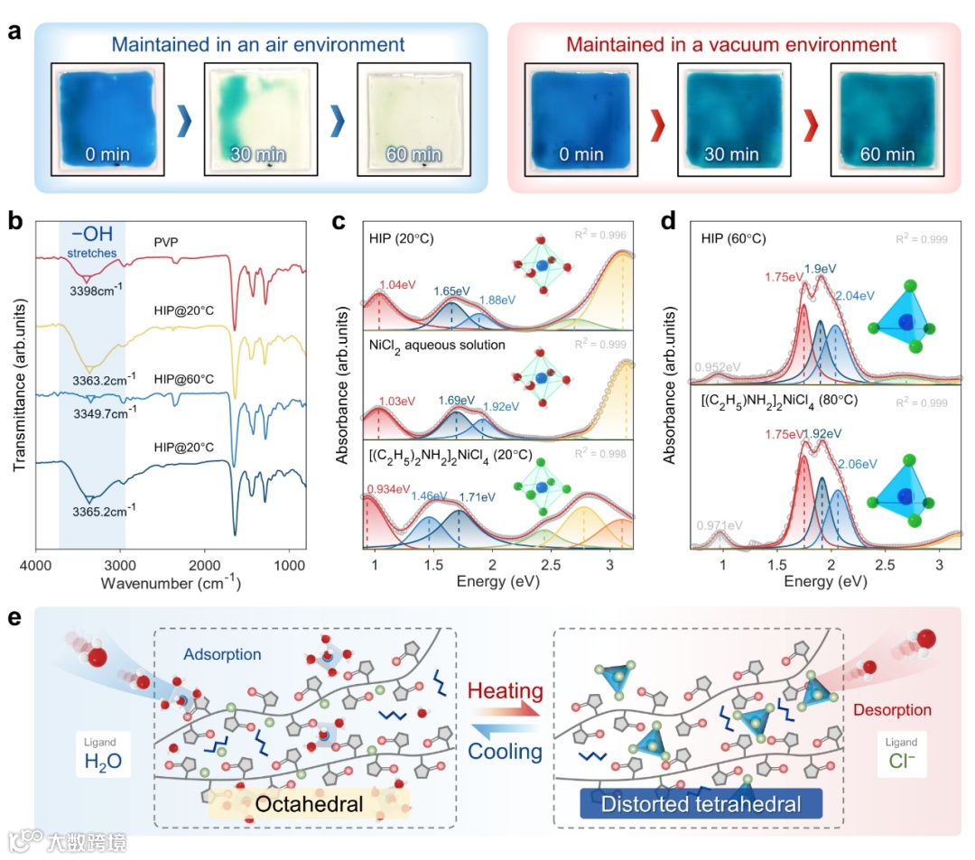 (2)机制揭示:结合原位变温谱学分析、电子-磁性表征与热响应行为测试等多维手段,系统解析了HIP热致变色过程中Ni2+配位构型在水合/脱水状态下的动态重构机制,明确了结构转变与光学响应之间的因果联系。