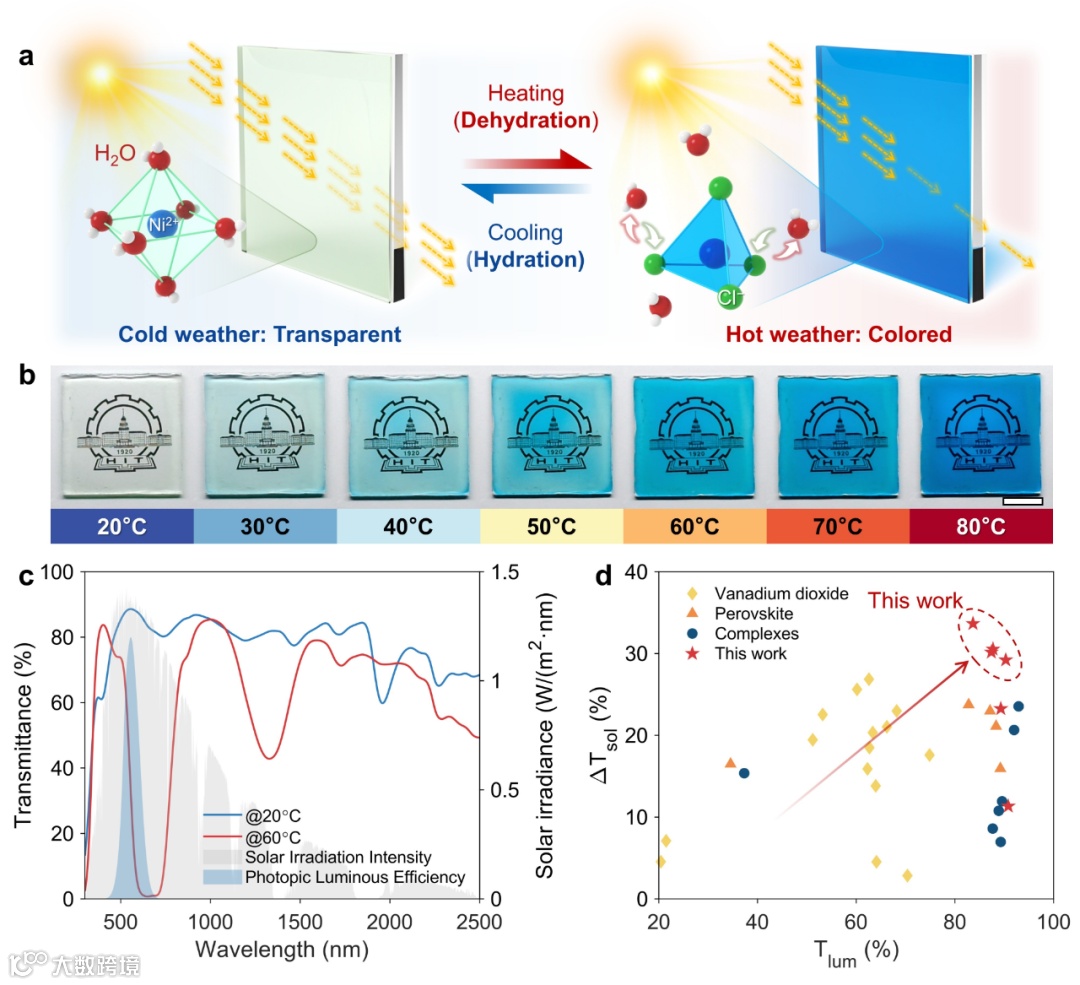 许多过渡金属配合物在高低温之间具有显著的光学对比,展现出在热致变色智能窗中的应用潜力。近年来,基于配体交换或固态相变的热致变色配合物体系不断涌现,通常需嵌入聚合物基体中以提升可加工性与稳定性。然而,极性配合物与非极性聚合物间易发生相分离并形成微孔,导致光散射增强、雾度升高,进而损害可视性。同时,空气中的水和氧也可能引起材料的溶解和泄漏,限制其长期稳定性。热致变色的本质在于金属离子配位构型的转变,尤其是八面体与四面体(或平面方形)结构之间的可逆切换。研究表明,这种结构变化可由水分子的吸附与脱附驱动。因此,基于可逆水合/脱水机制构建的热致变色系统,兼具良好的光学性能与结构稳定性,是实现高性能智能窗的有力方案。