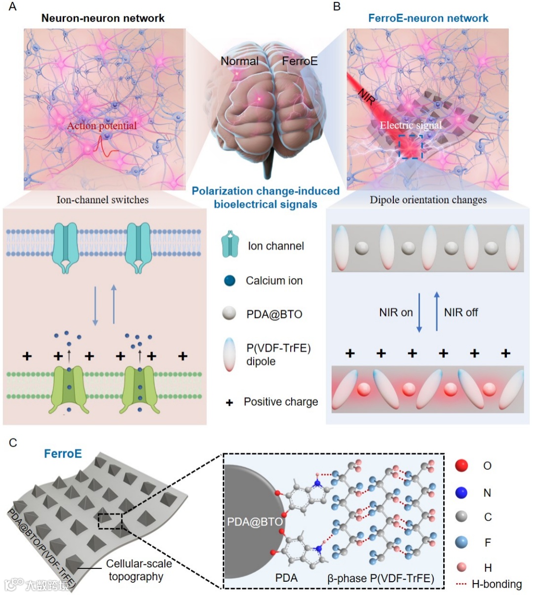 为解决植入式生物电子器件与神经组织的界面适配问题,杜学敏研究员团队与鲁艺研究员团队合作,成功设计出了类神经界面材料与铁电生物电子器件(Ferroelectric bioelectronics, FerroE)。