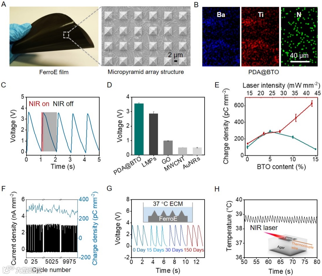 该FerroE由三大核心要素构成(图1):(1)生物相容性聚多巴胺修饰的钛酸钡颗粒(PDA@BTO),用于高效光-热转换和增强铁电性能;(2)铁电聚偏氟乙烯-三氟乙烯共聚物(P(VDF-TrFE)),通过可逆极化变化实时产生电信号;(3)近似神经元尺度的微锥阵列结构,促进神经元黏附、神经突生长及网络化连接。上述要素的协同作用,使FerroE不仅具备优异的力学柔性和复杂拓扑结构,而且展现出高效、稳定的光诱导极化变化产生电信号的能力:可在100毫秒时间内产生约3.6伏电压,并在万次光照循环或在近生理环境下浸泡180天无明显衰减(图2)。FerroE优异的柔性、精心设计的拓扑结构与独特的极化变化产生电信号的能力,有望促进其与神经组织的无缝整合与自适应信息交互。