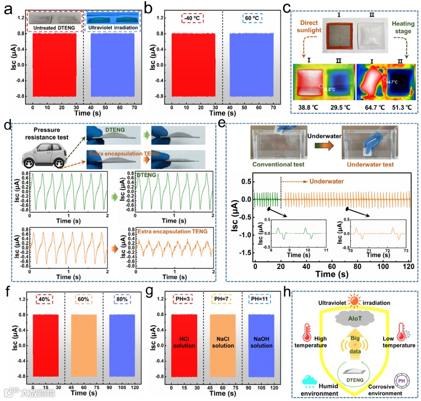 图4. a) 经过紫外线照射后最优DTENG的短路电流(Isc);b) 经过极端温度处理后最优DTENG的短路电流 (Isc);c) DTENG和发泡前样品的红外热成像图; d) DTENG的抗压测试;e) 水下测试中用手指捏压时测得的短路电流 (Isc) 信号;f) 不同湿度水平后最优DTENG的短路电流(Isc);g) 经过盐酸溶液、氯化钠溶液和氢氧化钠溶液腐蚀处理后最优DTENG的短路电流(Isc);h) 外部环境中干扰DTENG摩擦电性能的主要因素。