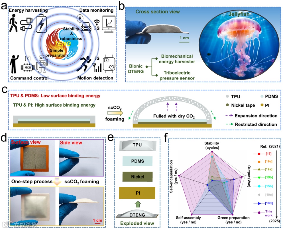 图1. a) 展示TENGs简单制备与摩擦电性能之间矛盾关系的示意图;b) DTENG的横截面宏观形貌图及海洋中的水母图片;c)DTENG通过一步法超临界CO2 (scCO2)周边约束发泡的成型原理图;d) scCO2发泡前后DTENG宏观形貌对比;e) DTENG结构设计的分解视图;f) DTENG与报道的类似穹顶结构研究相比的突出优势。