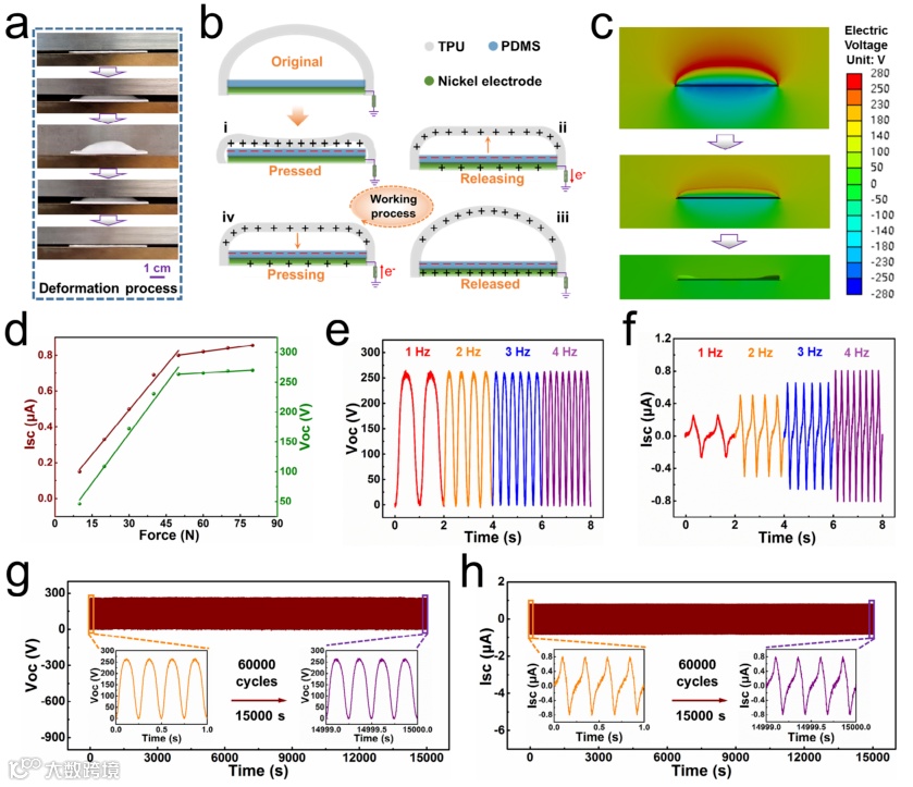 图3. a) 展示DTENG在外力作用下变形过程的照片;b) DTENG在按压和释放循环中工作机理的示意图;c) DTENG从释放状态被按压至压缩状态时摩擦电势变化的模拟结果;d) 使用不同压缩力按压DTENG时,其短路电流(Isc)和开路电压(Voc)的拟合曲线;e) DTENG的开路电压 (Voc) 和f) 短路电流(Isc)随冲击频率在1至4 Hz范围内变化的情况;g) DTENG在50 N压力下连续运行60,000次(15,000秒)的开路电压(Voc)和h) 短路电流 (Isc) 长期稳定性。