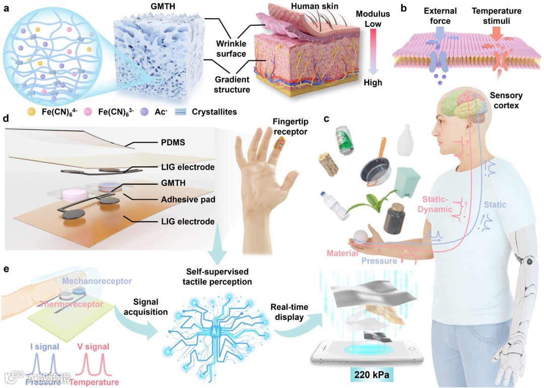 皮肤是人体与外界交互的关键界面和天然屏障。它不仅提供物理保护,其精妙的感知机制—如通过帕西尼小体感受压力、通过温觉受体分辨冷暖以及可形变的褶皱结构和梯度模量,使人类能够精细地感知并响应外界刺激。然而,脑卒中等神经疾病的高发(尤其是在老龄化趋势下),常导致患者出现触觉感知障碍。这种障碍使他们难以识别温度变化(易烫伤)、无法精准控制抓握力度(易捏碎物品),严重影响了日常生活质量和安全。此外,现有智能假肢配备的电子触觉传感器(如摩擦电、电容、压阻式)在实用化中面临显著挑战:需外接电源、难以可靠识别材料特性(尤其对电学属性相似的物体)、易受开放环境干扰,且缺乏在非预设压力条件下实现自监督感知的能力。
