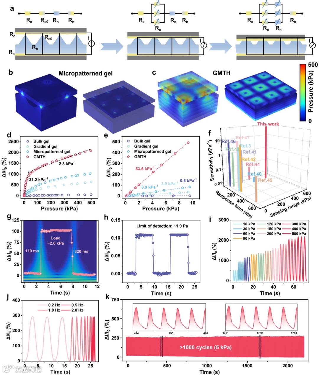 图3. 热电凝胶主动压阻敏感机制和性能