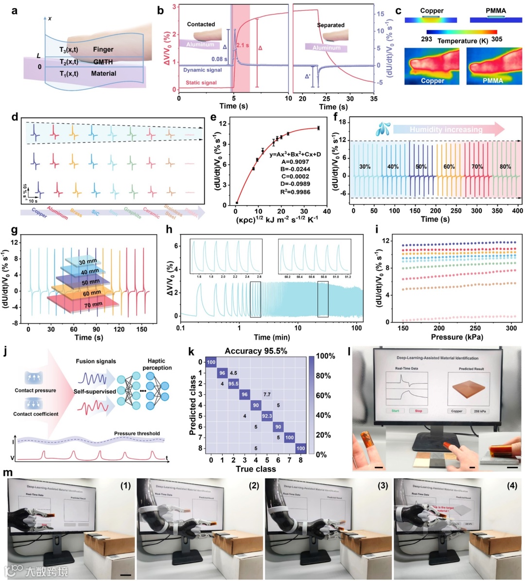 水凝胶表面具有类似皮肤褶皱的金字塔微结构,内部则具有梯度模量,使其具备超高压力灵敏度(53.6 kPa-1)、快响应(110 ms)和宽量程(0-500 kPa),同时异常坚韧(韧性26.22 MJ m-3)(图2)。该凝胶受体的“自驱动”能力源于人体皮肤持续散发的热量。热电水凝胶通过热伏效应可将人体热量转化为电能,利用主动压阻效应直接“无源”地将压力感知转化为可探测的电信号,而无需外部供电(图3)。当受体接触物体时,材料的热扩散能力不同,会导致凝胶冷热端温差变化速度(电压变化率)显著不同。受“冷热感觉”原理启发,通过监测凝胶电压变化率,受体能在短短80毫秒内(最快40毫秒)识别出材料特性,极大提高了材料识别速度和效率。
