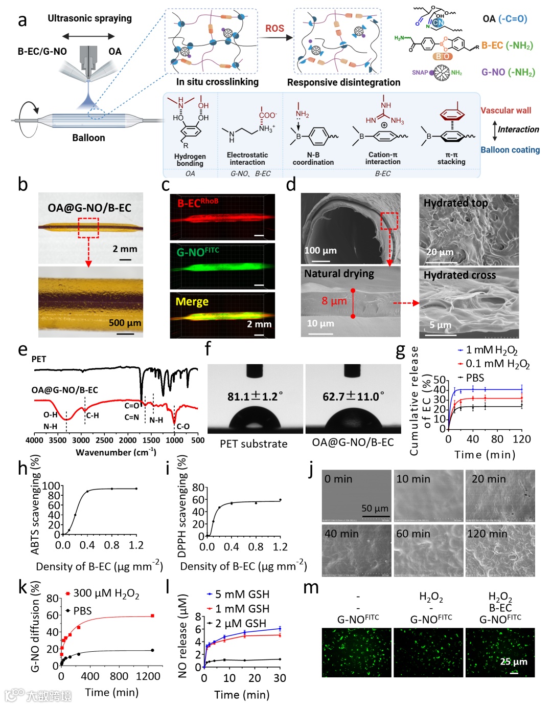 OA@G-NO/B-EC水凝胶通过超声静电喷涂工艺精确制备,主要由可逆的苯硼酸咖啡酸酯前药(B-EC)和大分子一氧化氮(NO)供体(G-NO)组成。二者通过席夫碱反应与多巴胺修饰的氧化多糖(OA)在共喷涂过程中实现瞬时自交联。水凝胶能够通过氢键、阳离子-π等多重作用力与血管内壁发生相互作用。双动态共价键(席夫碱键+苯硼酸酯键)使得该水凝胶涂层能在ROS积累时逐步解聚,精准释放抗氧化剂咖啡酸酯和NO供体。实验结果显示,在1 mM H₂O₂刺激下,药物释放率达到42%,ROS清除率超过85%。在300 μM H₂O₂刺激下,G-NO释放量即达到60%。