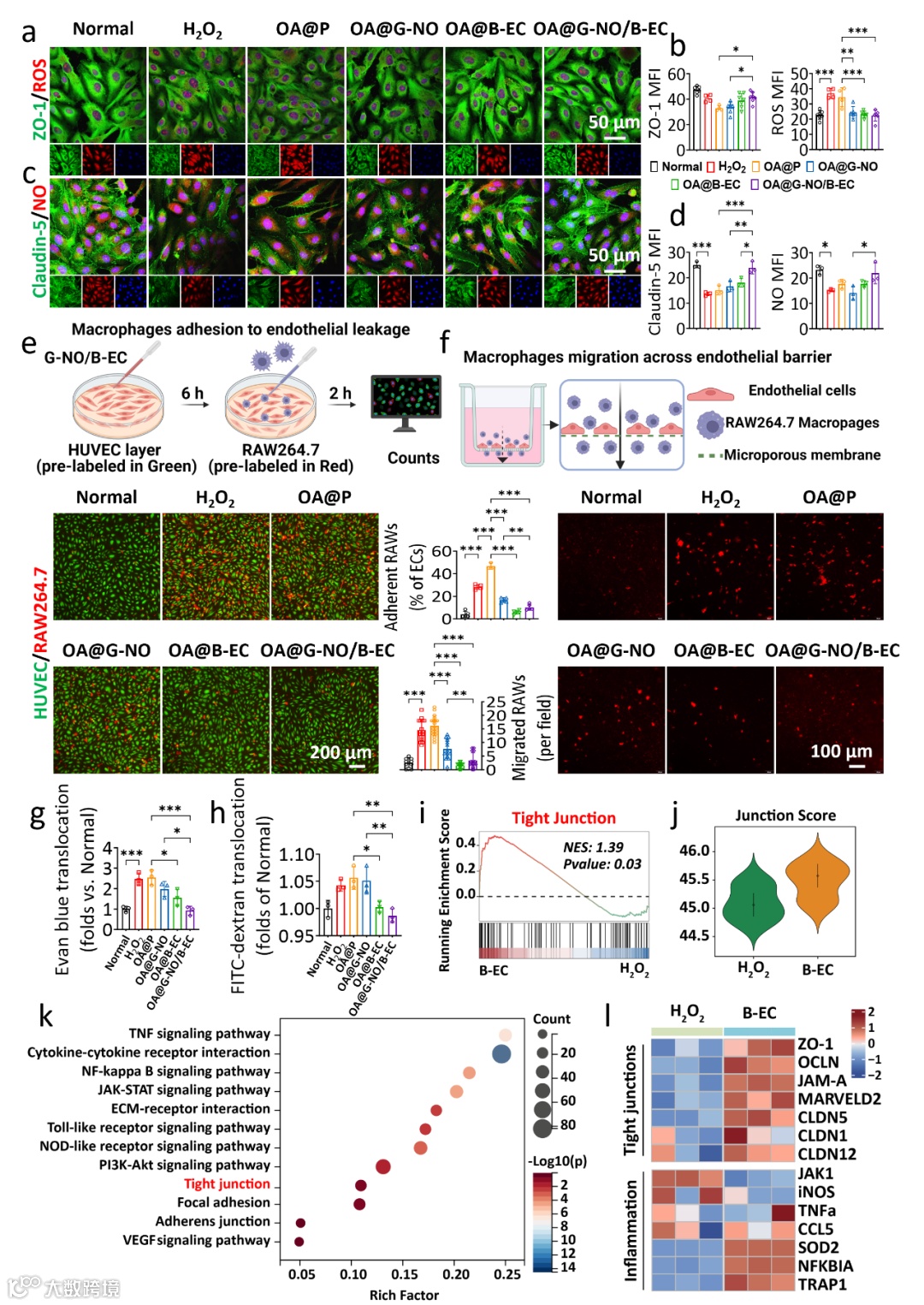 图3 OA@G-NO/B-EC介入后内皮间紧密连接和巨噬细胞渗透