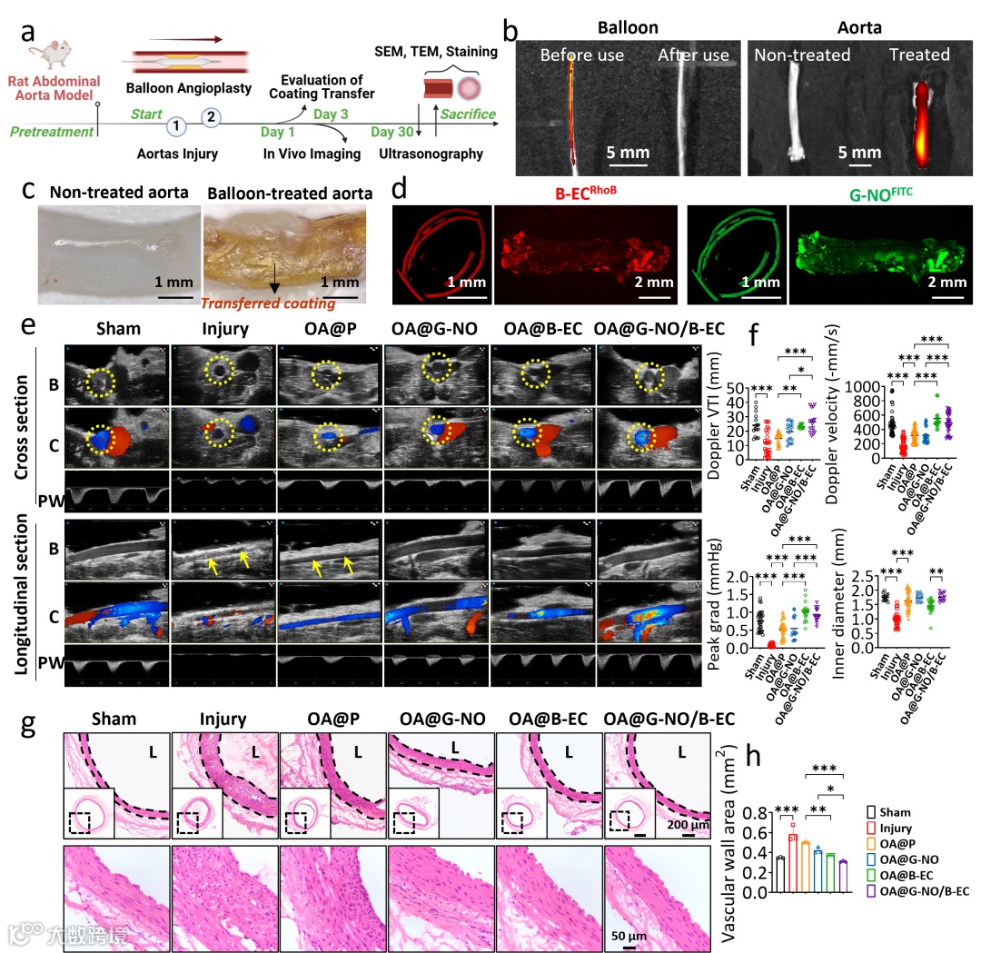 在大鼠腹主动脉模型中,水凝胶涂层能迅速转移到动脉壁上,且该涂层未促进血小板附着或聚集,无栓塞风险。30天后超声显示,OA@G-NO/B-EC涂层组血流速度积分(VTI)提升12%,血管内径扩大17%。H&E染色显示新生内膜面积减少38%。