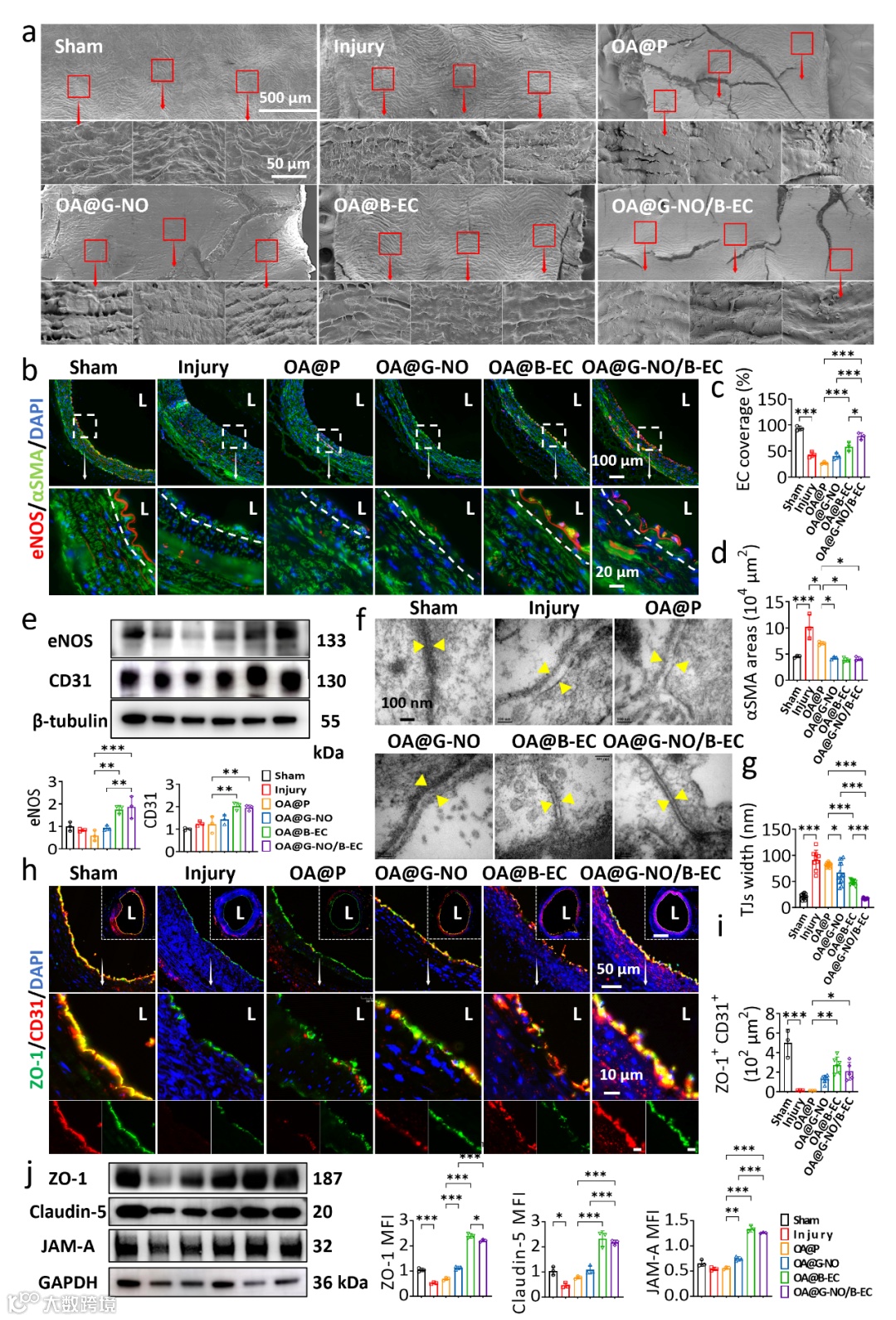 OA@G-NO/B-EC涂层显著促进了内皮细胞增殖与迁移(eNOS免疫荧光染色证实内皮覆盖率超70%),并恢复了内皮TJs的结构(TJs宽度从91.56 nm恢复至17.21 nm,接近正常水平)、提升相关蛋白表达和分布,为血管修复提供了长效保护。该凝胶涂层能够有效促进内皮修复,抑制炎症反应,防止再狭窄。