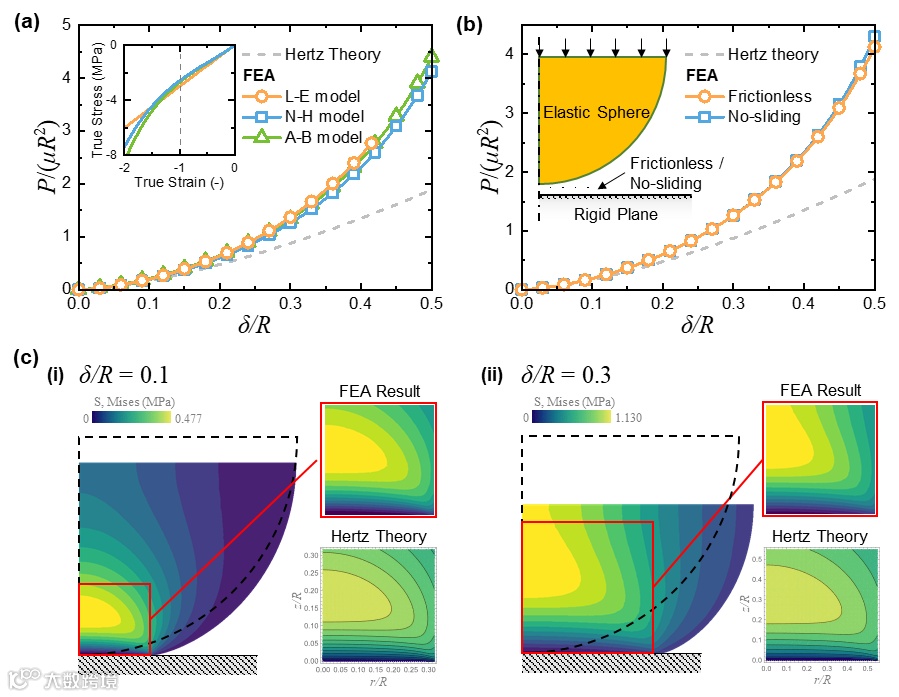 图3 压扁问题中非线性效应的分析。(a) 材料非线性对接触力的影响。灰色虚线表示Hertz理论的预测结果,而带有散点的曲线表示不同本构模型下的有限元分析结果(橙色圆形:线弹性(L-E)模型,蓝色方块:neo-Hookean(N-H)模型,绿色三角形:Arruda-Boyce(A-B)模型)。插图展示了各本构模型在单轴压缩下的应力-应变曲线。(b) 接触条件对接触力的影响。有限元分析结果分别给出了无摩擦(橙色圆形)和无滑移(蓝色方形)条件下的接触力,同时也展示了Hertz理论的预测(灰色虚线)。(c) 弹性球体在(i)小压缩比(δ/R = 0.1)和(ii)大压缩比(δ/R = 0.3)情况下的von Mises应力分布。放大图突出显示了接触区域附近的应力分布,并与Hertz理论的预测进行比较。对于相对较小的变形(如δ/R = 0.1),有限元分析结果与Hertz理论吻合良好。然而,对于相对较大的压缩变形(如δ/R = 0.3),有限元分析结果与Hertz理论之间存在显著偏差,表明几何非线性在压扁问题中对应力分布有显著影响。