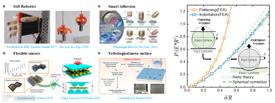 图1 压扁问题的应用背景(包括软体机器人、智能粘附、柔性传感、摩擦学超表面)及经典的小变形接触力学模型(Hertz Theory,灰色虚线)对接触力的预测偏差(黄色带圆点实线)。