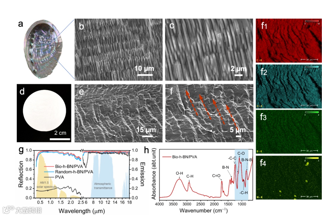 基于此,上海理工大学顾敏院士、张轶楠教授团队提出了一个设想:可否通过设计辐射制冷与热传导路径,构建一个多模态的户外设备热管理方案?受鲍鱼壳有序"砖-泥"结构的仿生启示,创新性地设计了六方氮化硼/聚乙烯醇(Bio-h-BN/PVA)仿生复合薄膜(图1)。通过真空辅助过滤工艺,实现了h-BN纳米片在PVA基体中的高度定向组装,兼具高太阳反射率(96.5%)、宽带中红外发射率(0.95)以及高热导率(23.6 W m-1 K-1)(图2)。该研究的核心创新之处在于将仿生结构设计与多物理场耦合机制相结合,通过优化导热路径与光散射界面,同步提升热传导与辐射制冷效率(图3和4),显著降低了户外电子设备的热平衡温度(13.49 ℃)(图5),并进一步揭示了非辐射换热系数对户外电子设备热管理的关键作用。该成果为应对人工智能芯片所面临的高能耗挑战提供了重要技术支撑,也为"双碳"目标下新一代高功率户外电子设备的可靠运行开辟了新路径。