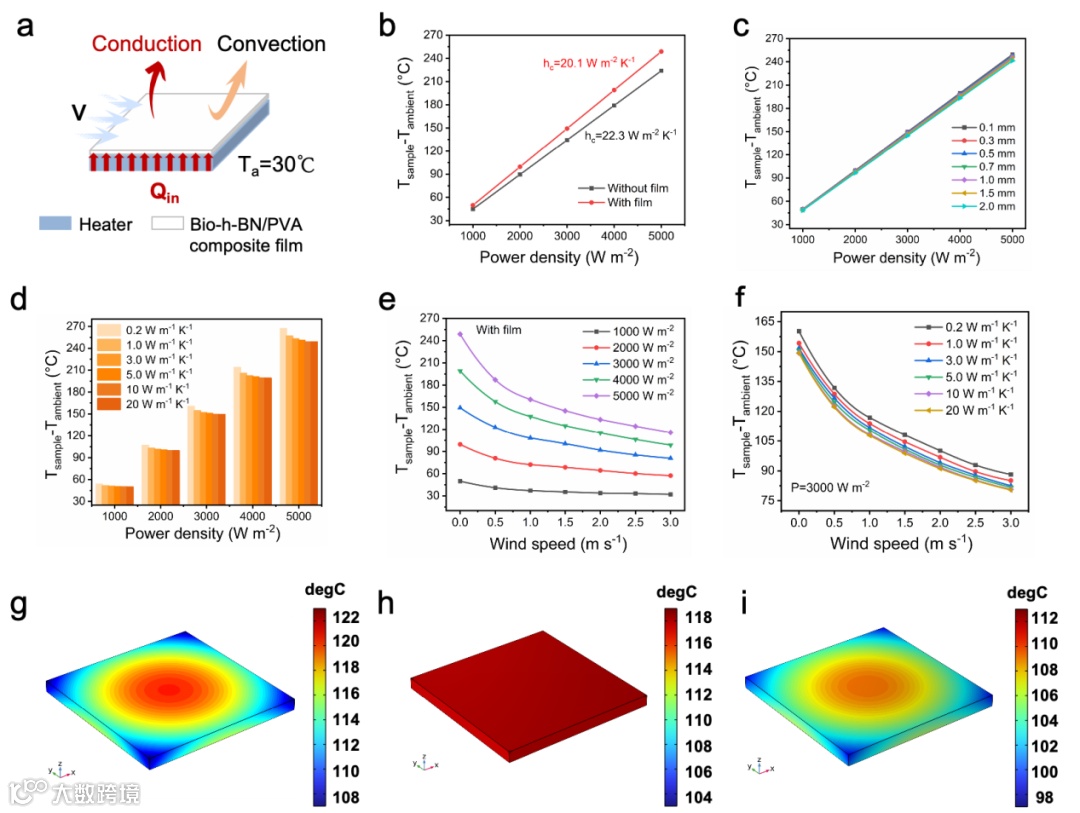 图4.Bio-h-BN/PVA复合薄膜的热行为仿真。a) Bio-h-BN/PVA复合薄膜在户外电子设备集成的概念设计,b) 有无Bio-h-BN/PVA复合薄膜时设备温度的变化,c)Bio-h-BN/PVA复合薄膜厚度对设备温度的影响,d)Bio-h-BN/PVA复合薄膜的热导率对设备温度的影响,e,f)风速对不同输入功率和热导率下集成Bio-h-BN/PVA复合薄膜设备温度的影响,g-i)裸设备、集成纯PVA薄膜及集成Bio-h-BN/PVA复合薄膜的设备热量分布图。