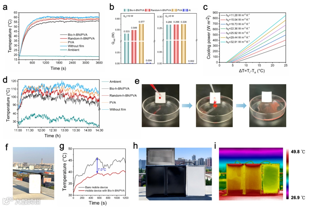 图5. Bio-h-BN/PVA复合薄膜的性能及应用。a) 室内温度曲线,b)不同输入功率下Bio-h-BN/PVA复合薄膜、Random-h-BN/PVA复合薄膜、纯PVA薄膜和铝板的热发射率,c)Bio-h-BN/PVA复合薄膜的净辐射冷却功率计算,d) 户外温度曲线,e) Bio-h-BN/PVA复合薄膜的耐污测试,f,g) 集成Bio-h-BN/PVA复合薄膜的移动设备照片和温度曲线,h,i)集成纯PVA薄膜和Bio-h-BN/PVA复合薄膜的LED广告牌照片及红外热图像。