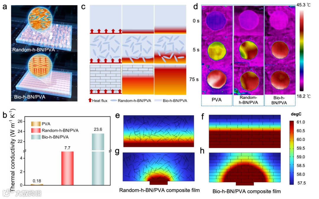 图3. 热导率对比及传热机制。a) Random-h-BN/PVA和Bio-h-BN/PVA复合薄膜的对比示意图,b) 纯PVA薄膜、Random-h-BN/PVA和Bio-h-BN/PVA复合薄膜的热导率,c,d) 纯PVA薄膜、Random-h-BN/PVA和Bio-h-BN/PVA复合薄膜的热传递路径示意图和红外热像图,e–h) Random-h-BN/PVA和Bio-h-BN/PVA复合薄膜在全局热源和局部热源下非辐射换热的数值模拟。