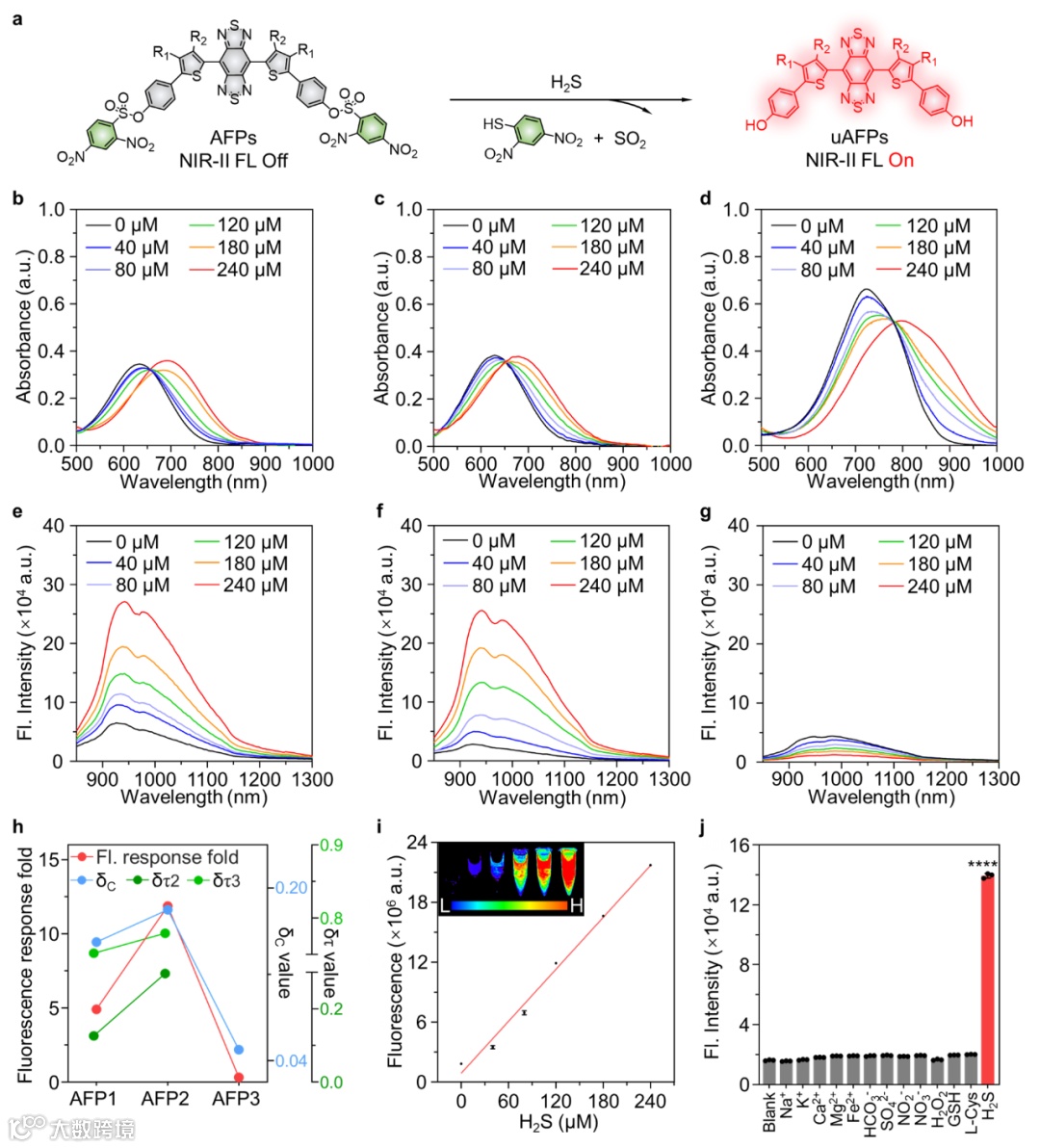 图3. a) APFs响应机理。b) AFP1、c) AFP2 和 d) AFP3 与不同浓度的 H2S 处理反应后的吸收光谱。e) AFP1、f) AFP2 和 g) AFP3 与不同浓度的 H2S 处理反应后的荧光光谱。h) 荧光响应倍数与δ值之间的相关性分析(R² = 0.8342)。 i) AFP2的响应线性。j) AFP2的响应选择性。