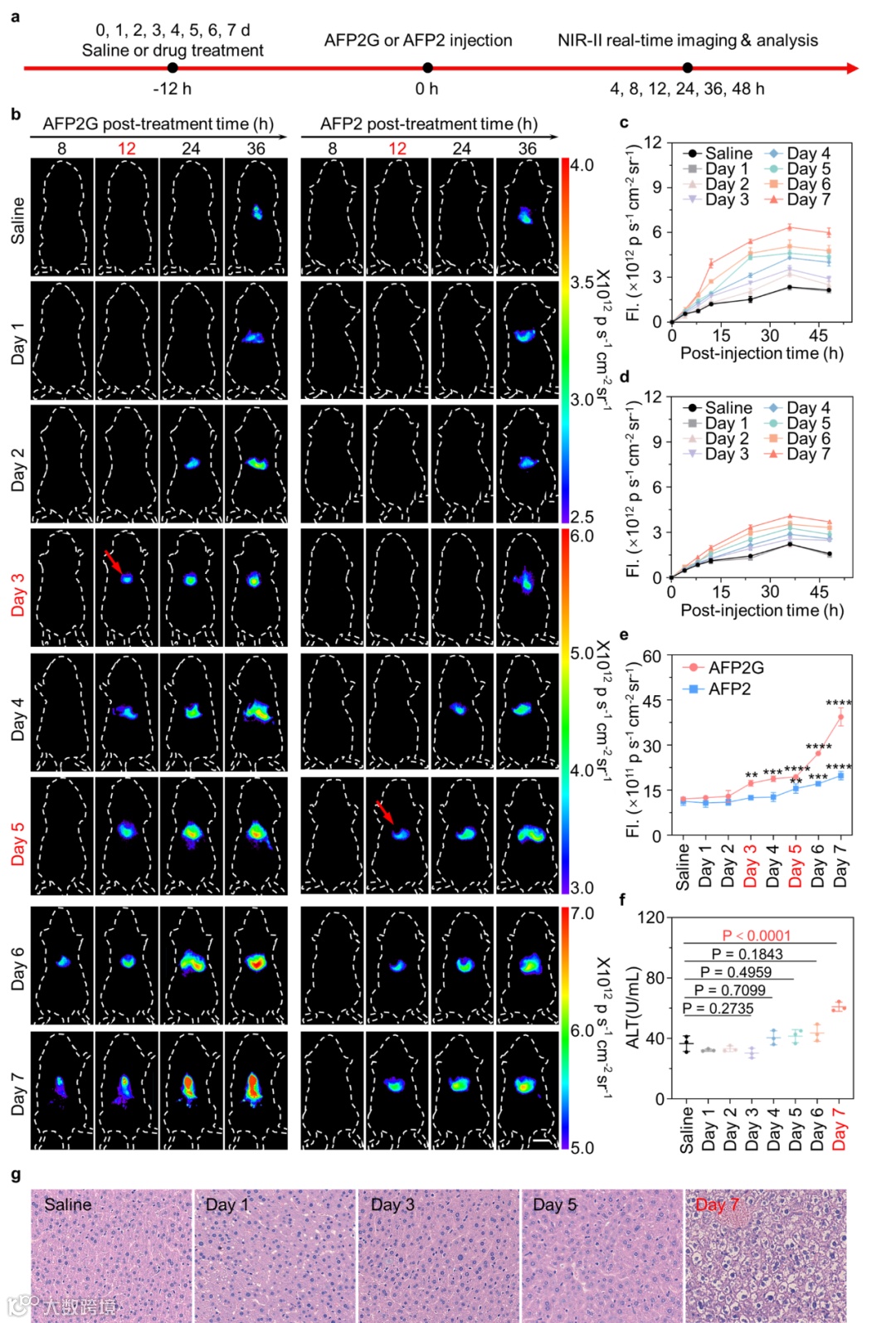 过量使用二甲双胍可导致肝组织中H₂S水平升高,诱发炎症和肝功能损伤,而传统血清学指标对早期损伤不敏感,加之现有纳米探针易被单核吞噬系统清除,难以实现对受损肝细胞的实时原位成像,限制了药物性肝损伤(DILI)的早期诊断。研究团队通过共组装N-乙酰半乳糖胺(GalNAc)修饰的嵌段共聚物赋予最优的探针AFP2水溶性,显著增强探针在肝实质细胞中的摄取效率,构建了具备肝细胞靶向能力的纳米探针AFP2G,以实现对药物性肝损伤(DILI)的早期、精准成像。在二甲双胍诱导的肝损伤过程中,AFP2G在药物处理第3天便可检测到肝区的明显近红外二区荧光信号增强,并实现了对肝组织中H₂S水平升高的动态监测,冷冻切片成像进一步支持荧光成像结果的准确性和敏感性。与之相比,传统生化指标(如ALT、AST)及组织病理学分析通常在药物处理第7天后才出现明显异常,表明AFP2G能够在肝细胞发生实质性损伤之前实现更早期的分子水平预警,显示其在DILI早期诊断中的重要应用前景。