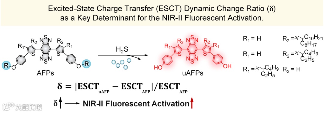 图1. 激发态电荷转移 (ESCT) 动力学变化率 (δ) 是近红外二区响应型荧光探针响应性能的关键决定性因素。
