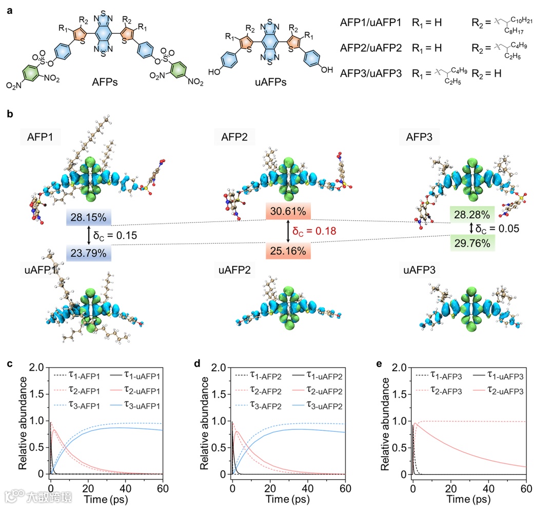 图2. AFPs 及荧光开启的形式 uAFPs 的分子结构(a),计算模拟分析AFPs及uAFPs第一激发态的电子空穴分布(b),AFPs及uAFPs的瞬态吸收光谱测试分析(c-e)。