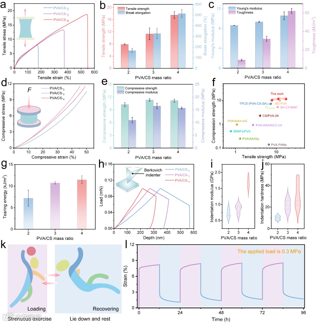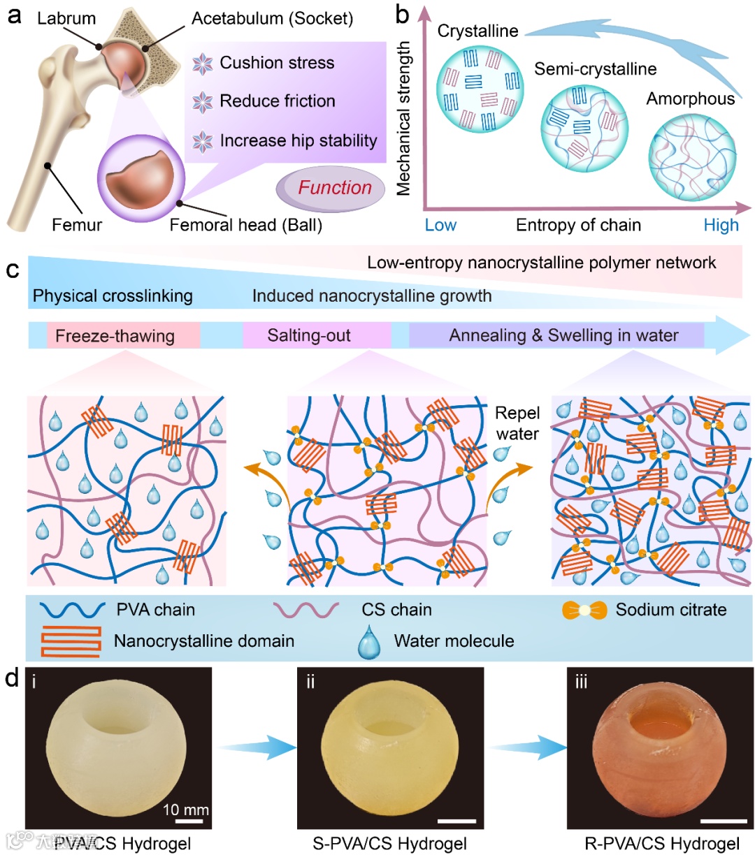 近期研究发现,链构象的熵态对聚合物材料的结晶结构和机械性能至关重要,即高熵聚合物的机械性能由于缺乏晶体结构而严重恶化。为了解决上述问题,中国科学院兰州化学物理研究所王晓龙研究员团队提出了一种低熵纳米晶域网络调控策略,即通过调节高熵非晶态和低熵晶态结构的比例来构建机械鲁棒性的润滑水凝胶。具体来说,将不同聚乙烯醇(PVA)和壳聚糖(CS)质量比的PVA/CS水溶液经过一次冷冻-解冻循环形成PVA/CS水凝胶网络,再结合盐析效应与热退火技术,进一步增强其机械性能,其中盐析诱导聚合物链聚集来形成强氢键的PVA/CS超分子基质。同时,热退火工艺通过在PVA侧基之间建立新的氢键,进一步无缝整合了交联聚合物链网络的致密化和结晶优点,从而改变了聚合物网络的微观结构。随后,通过提高聚合物网络中PVA大分子链的百分比(相对于CS的比例)来诱导PVA链的结晶生长,获得了具有低熵聚合物链态和高结晶度的PVA/CS水凝胶。最后经再水化后获得具有高机械强度和优异润滑性的水凝胶材料,且性能显著优于传统的PVA水凝胶。研究发现可以在很宽的范围内调节该水凝胶的机械性能,包括断裂强度(7.7~17.5 MPa)、弹性模量(8.6~10.6 MPa)、韧性(8.8~62.1 MJ m-3)、压痕硬度(10.4~21.7 MPa)等,同时该水凝胶的摩擦系数可低至0.026,其与天然软骨相当(0.001~0.030),且在10万次的连续摩擦条件下也具有很好的润滑持久性,因此成功实现了水凝胶在机械强度和润滑性能上的双重提升,解决了传统水凝胶在高负载条件下易破裂或变形的问题。此外,研究还展示了PVA/CS水凝胶在模拟人体负载组织中的优异表现,特别是在人工髋关节中的应用,为高性能人工关节润滑材料的研发提供了新思路。