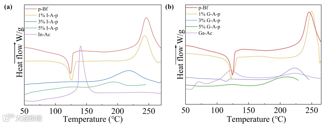 图1. DSC曲线:(a)不同比例的的I-A-p和(b)不同比例的G-A-p。