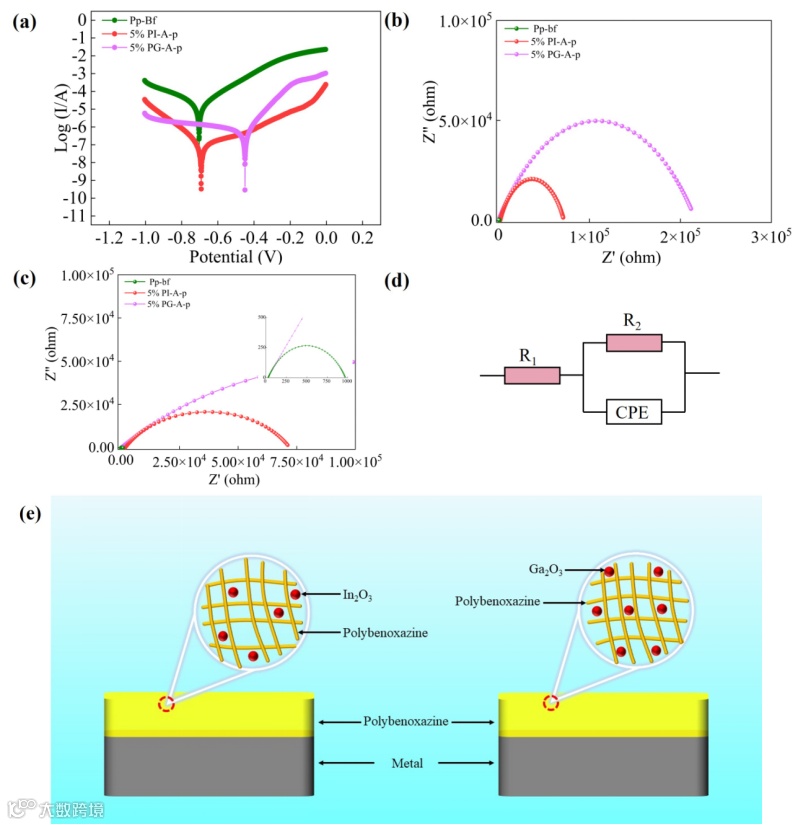 图3. (a) 3.5% NaCl 电解质溶液中的Tafel曲线,(b) 3.5% NaCl电解质溶液中 Pp-Bf、5% PI-A-p 和 5% PG-A-p 涂层的Nyquist图,(c) Nyquist局部放大图;(d) 涂层的等效电路图,(e) 保护机制。