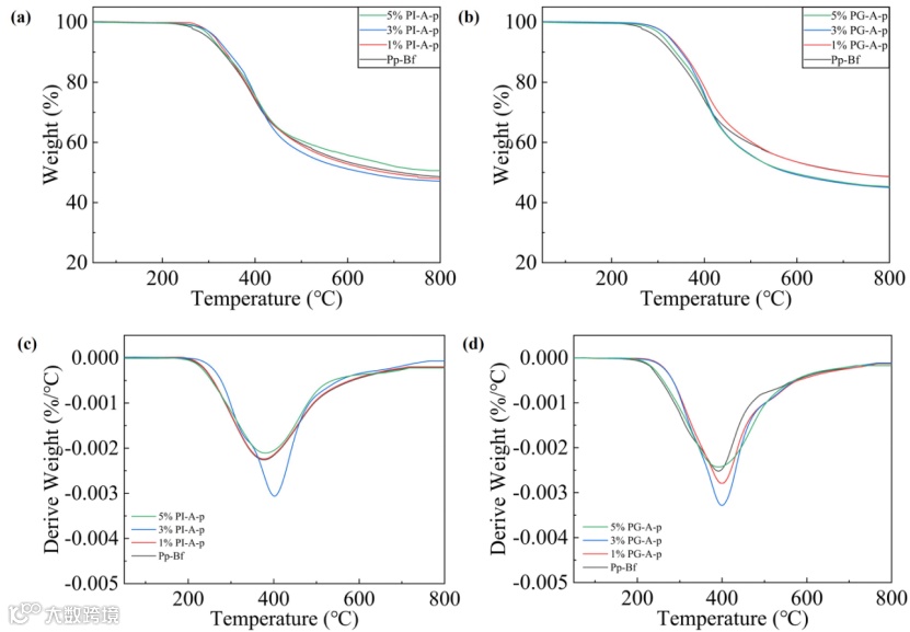 图2. (a) Pp-Bf和1%,3%,5% PI-A-p的TGA曲线,(b) Pp-Bf和1%,3%,5% PG-A-p的TGA曲线,(c) Pp-Bf和1%,3%,5% PI-A-p的DTG曲线,(d) Pp-Bf和 1%,3%,5% PG-A-p的DTG曲线。