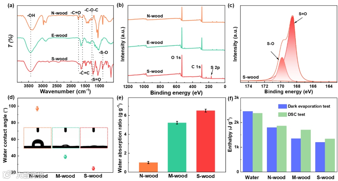 图2. N-wood、E-wood和S-wood的化学结构和亲水性特征。a) FT-IR光谱,b) 宽扫描XPS,c) S 2p光谱(S-wood),d) 水接触角,e) 水吸收率,f) 水蒸发焓。