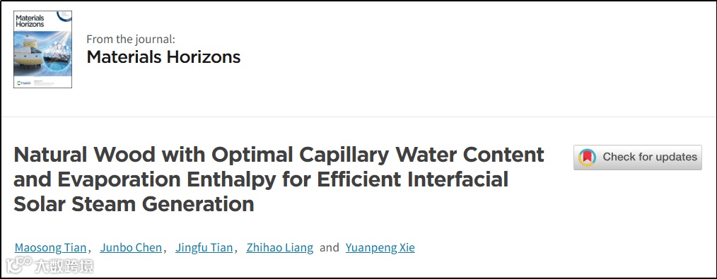 相关成果以“Natural Wood with Optimal Capillary Water Content and Evaporation Enthalpy for Efficient Interfacial Solar Steam Generation”为题,在国际期刊《Materials Horizons》(中科院二区,IF=12.2)上发表,文章通讯作者为贵州大学化学与化工学院谢远鹏特聘教授,第一作者为贵州大学2022级硕士研究生田茂松。