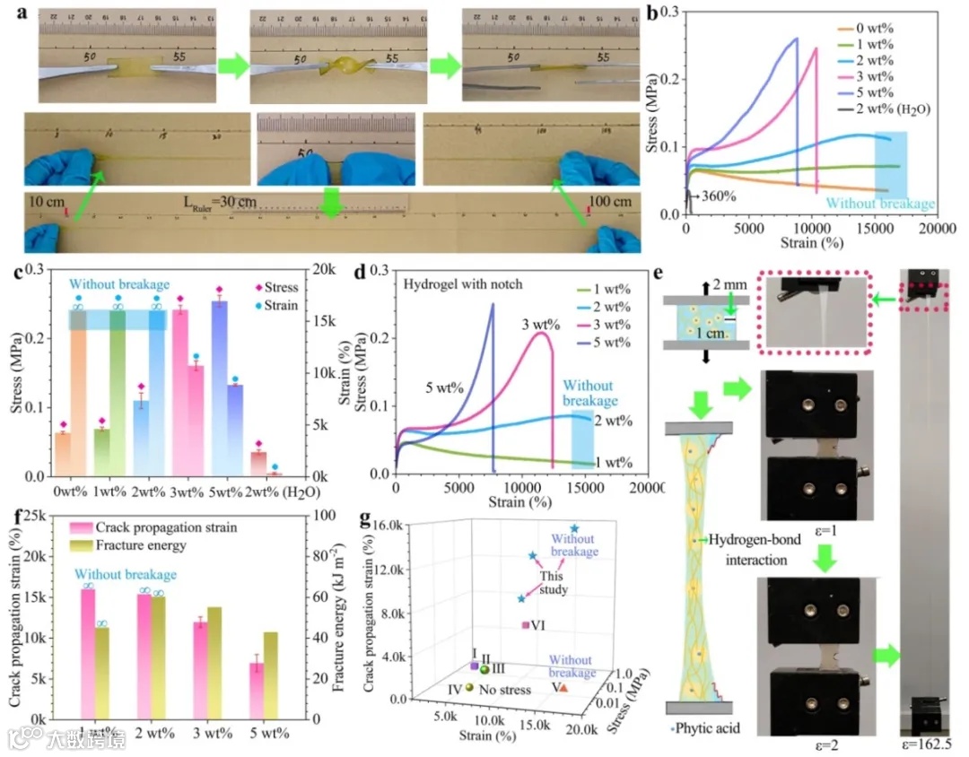 图2. 力学性能。(a)凝胶实物照片:染色凝胶横向拉伸(伸长率>9000%)。(b)应力-应变曲线。(c)应变与应力。(d)缺口凝胶的应力-应变曲线。(e)缺口凝胶(2 wt%)拉伸至16250%时的照片。(f)缺口凝胶的应变与断裂能。(g)与文献报道性能对比。
