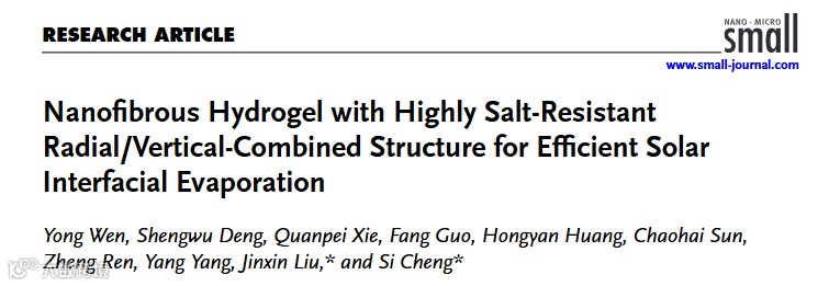该工作以“Nanofibrous Hydrogel with Highly Salt-Resistant Radial/Vertical-Combined Structure for Efficient Solar Interfacial Evaporation”为题发表在《Small》上。文章第一作者是苏州大学2022级研究生文勇,程丝教授和刘金鑫副教授为共同通讯作者。