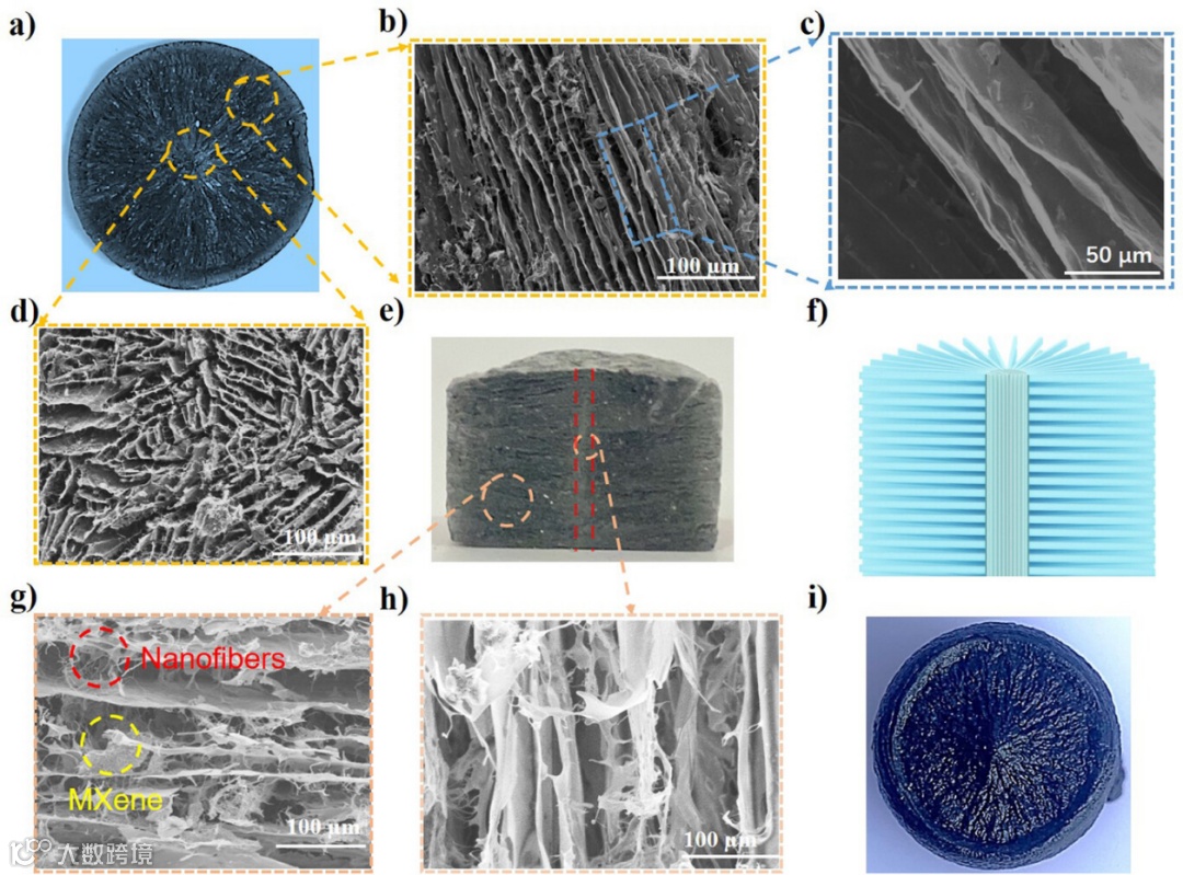 该研究通过冷冻铸造技术,在冷冻过程中控制冷冻温度,达到控制冰晶生长的作用,实现了内部垂直定向,外侧径向结构的水凝胶。这种水凝胶协同利用了定向结构的快速水运输能力和径向结构的优异的热约束性能,显著提高了其界面蒸发的性能。这种具有外部径向通道和内部垂直定向通道的一体化结构使该蒸发器具有出色的水传输能力,并减少了热量损失,从而实现了卓越的蒸发性能和高抗盐性。在水凝胶中加入纳米纤维不仅能增强水凝胶的稳定性,还能促进水的传输。