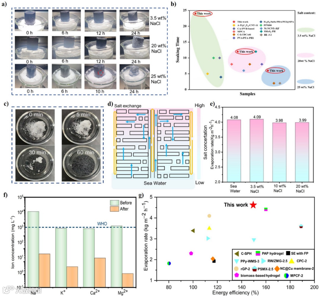 MXene的加入使得PMS-4在250–2500 nm波段的光吸收率达92%(图3 a),且在1 kW m-2辐照下表面温度升至36°C(纯水仅27.2°C),红外成像显示其形成冷蒸发面(30.6°C),减少热损失并利用环境能量(图3 b,c)。蒸发速率随暴露高度增加,2 cm时达4.62 kg m-2 h-1(效率146.57%),归因于更大的侧面吸热面积(图3 d,e)。DSC测试表明PMS-4中水的蒸发焓(1800 J g-1)仅为纯水的75%,得益于亲水基团调控的中间水占比提升(图3 f,g)。长期测试中,PMS-4在3.5 wt% NaCl溶液中保持稳定蒸发(4.62 kg m⁻² h⁻¹),7次循环后仍维持高效(4.20±0.42 kg m-2 h-1),证实其耐久性(图3 h,i)。
