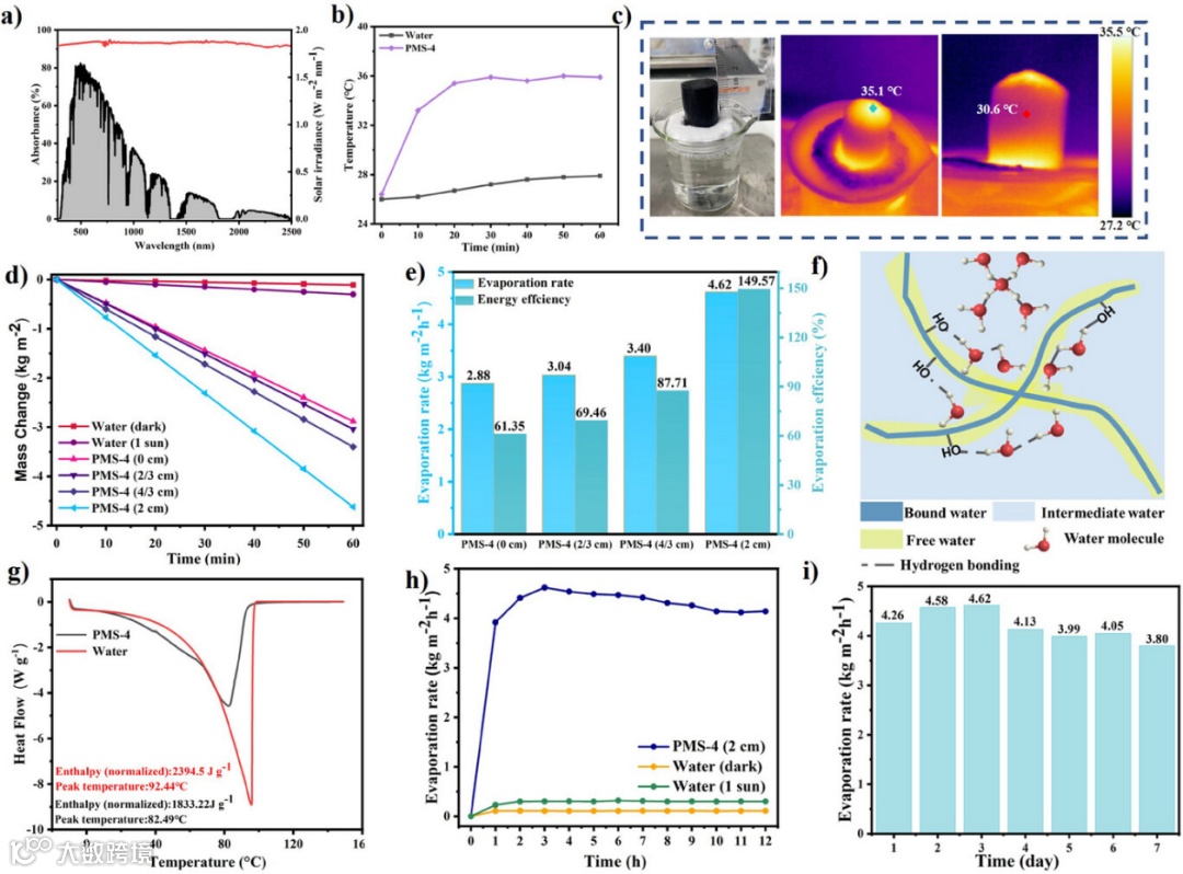 图3.PMS蒸发器的界面蒸发性能及机理分析和蒸发稳定性