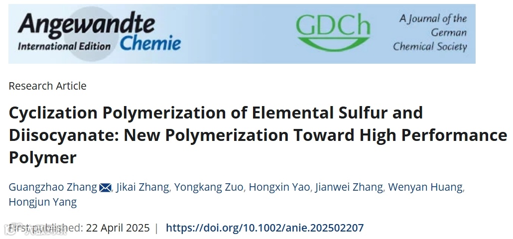 该工作从聚合反应源头创新,丰富了高分子合成方法,对单质硫的高价值利用和高性能聚合物材料的制备有重要意义,相关工作以题目:Cyclization Polymerization of Elemental Sulfur and Diisocyanate: New Polymerization Toward High-Performance Polymer在线发表于Angewandte Chemie International Edition.
