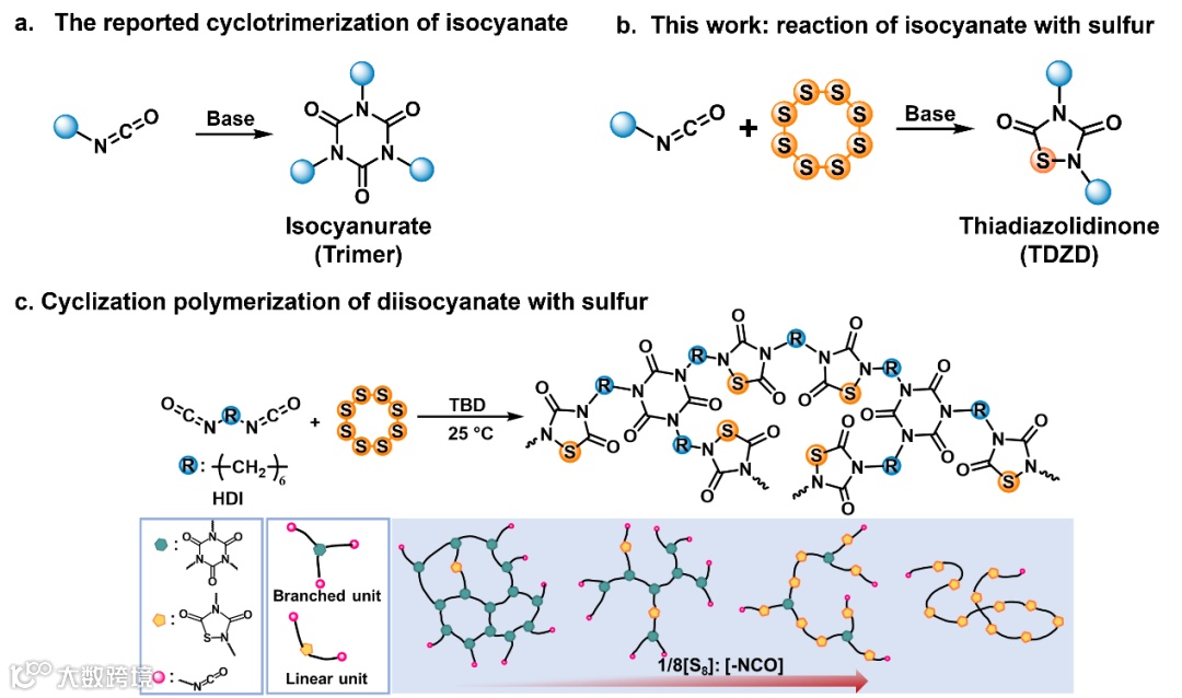 近日,他们报道了一种单质硫与异氰酸酯的成环聚合反应。该反应的机理与前两种反应均不同,其单体之间的连接是通过两种单体的成环实现,是一种新型杂化共聚反应。异氰酸酯是制备热塑性弹性体、粘合剂、涂料等的主要原料,也是最常见的聚合单体之一。但异氰酸酯与单质硫的聚合反应则是首次报道。