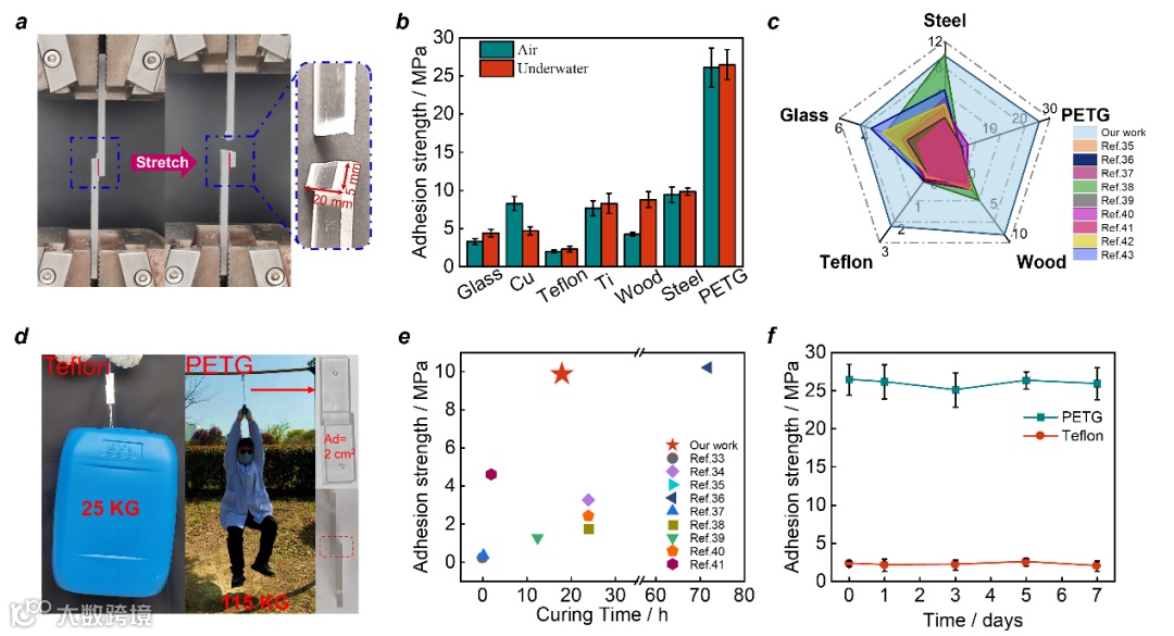 所得聚合物具有优异的力学性能和热稳定性,有可能发展成为一种高性能高分子材料。特别是其预聚物对各种基底都表现出很强的粘合力(包括通常粘合剂难以粘结的材料)。例如:预聚物对PETG和Teflon的水下粘合强度高达26.3 MPa和2.3 MPa,为目前已有报道中的最高值。