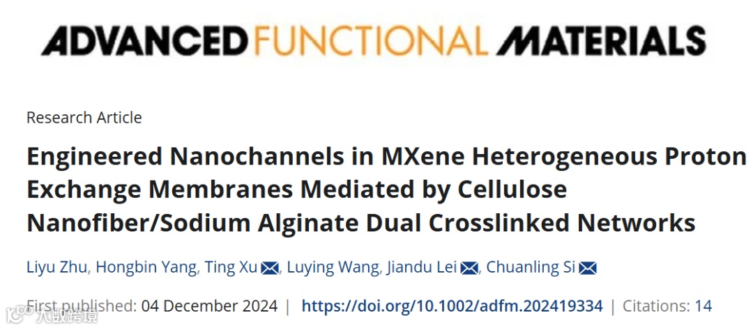 该论文以题为“Engineered Nanochannels in MXene Heterogeneous Proton Exchange Membranes Mediated by Cellulose Nanofiber/Sodium Alginate Dual Crosslinked Networks”发表在《Advanced Functional Materials》上(中科院一区TOP期刊,IF:18.5),并被遴选为封面论文(Cover)(图1)。天津科技大学朱礼玉为第一作者,天津科技大学司传领、徐婷教授以及北京林业大学雷建都教授为共同通讯作者。