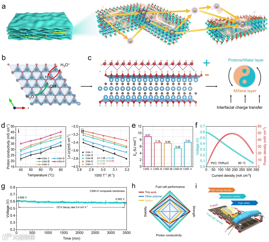 图5. CNF/SA/MXene复合质子交换膜的质子传导行为及燃料电池性能