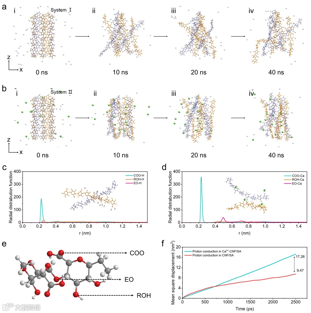 图4. CNF/SA复合体系在钙离子参与前后的结构变化以及质子传导的均方位移模拟